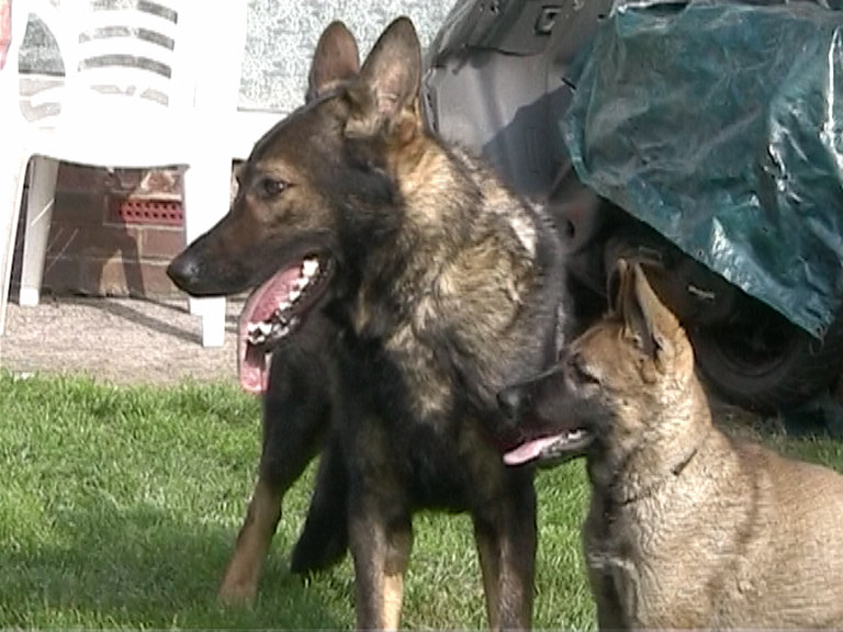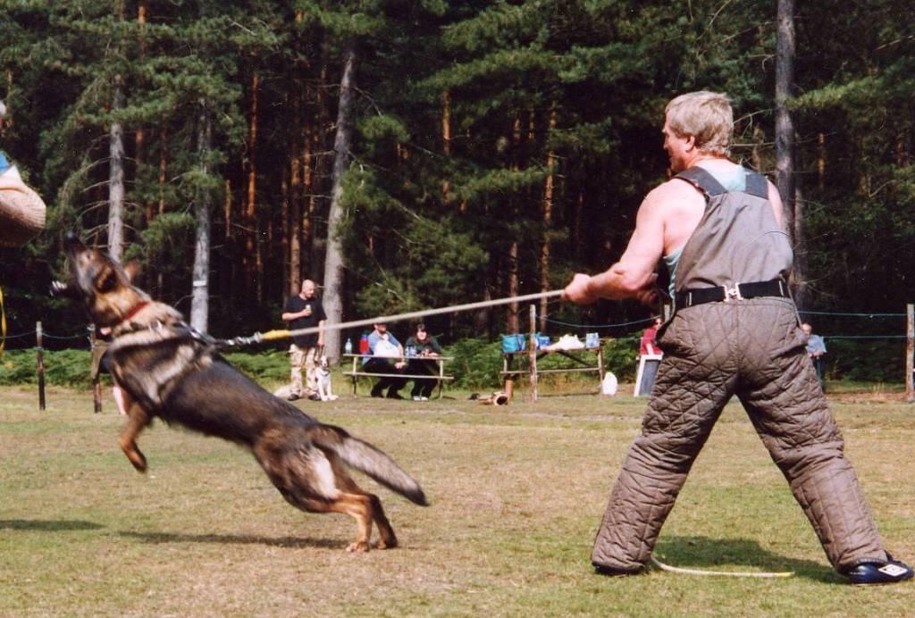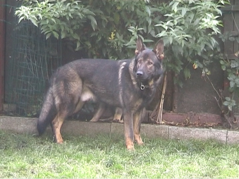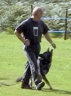 Well.... what can I say about this dog - big, strong, loyal, loving, a gentle giant, you run out of good words to describe him. If ever you need some one to sort it out - just call Leo. Protective, when needed - loving, kind and gentle any other time. Everyone who meets him loves him. I can't count the number of times we have been asked if he was for sale (and NO he isn't) He loves playing 'uncle' to the new pups, watching out for them, teaching them the ropes. His obedience is excellent, again with that - I love to work - attitude. We often use him when training other people's dogs, as his calm and quietly confident nature rubs off on them. He is very fast and very agile. He clears the one metre hurdle from a standing start, with as much effort as if he was stepping up the kerb. He is a beautiful dark sable.