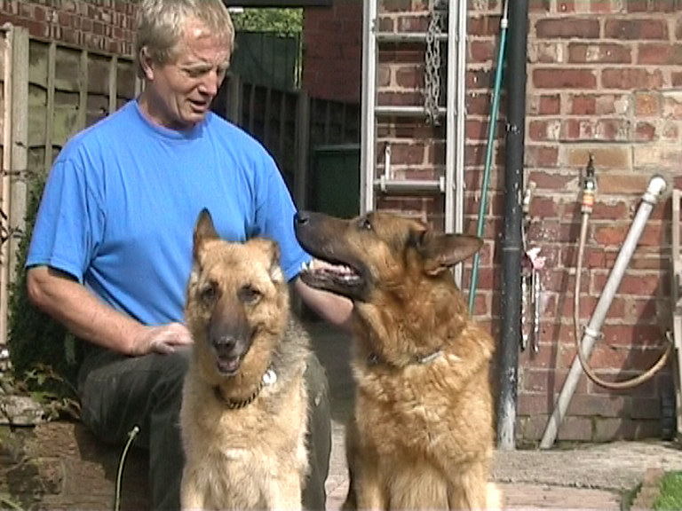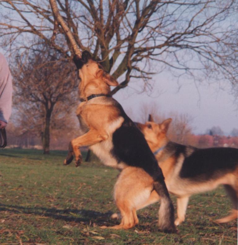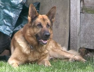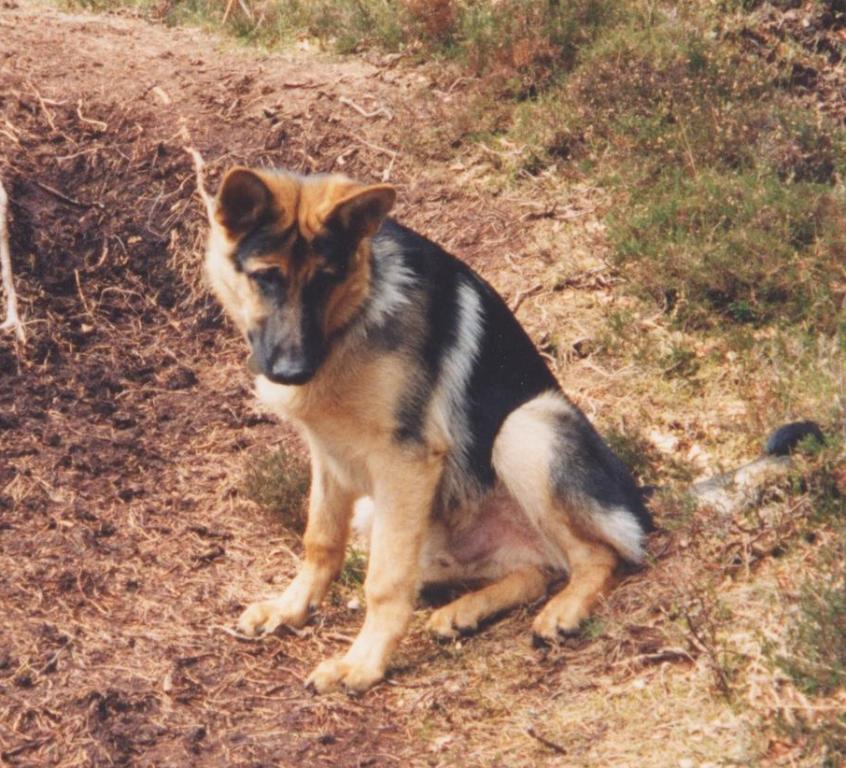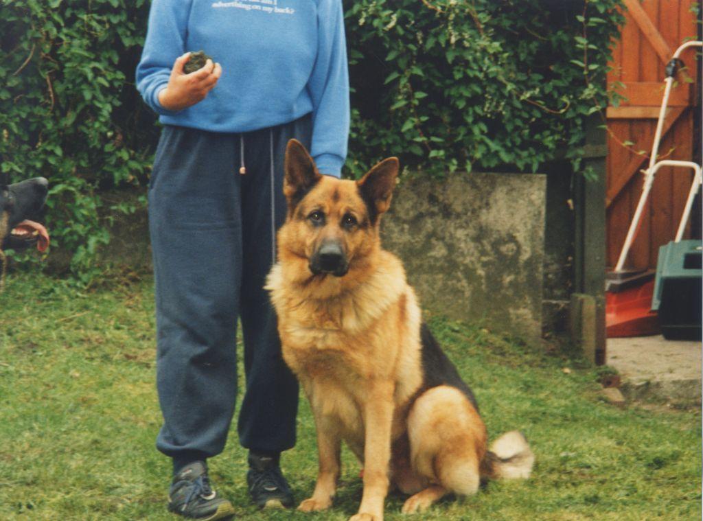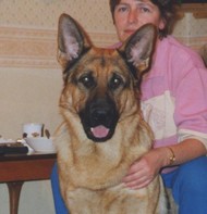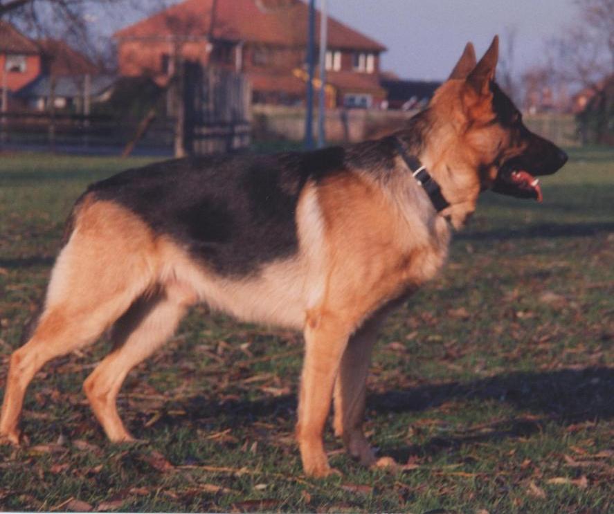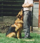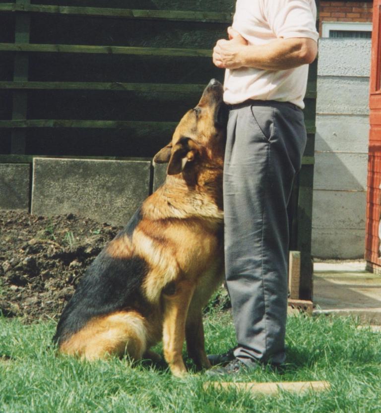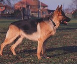 Louie was a dog and a half. Big, bold, beautiful and with so much character everyone just had to love him. He considered everyone in the whole world his best mate and he would think nothing of bounding across a field at full pelt to go and greet a total stranger who he knew was just dying to meet him and have their ears cleaned out (everyone had to have clear ears when Louie was around!) He was a natural born pack leader from day one. He caused us no end of problems - he demolished the living room, settees and all - chewed through the gate of his kennel in half a morning - pulled a double bed size extra thick blanket through a 2 inch square gap - and he wasn't even 6 months old by then, but we just couldn't help but love him. He was the dog that first got us interested in schutzhund, as far as he was concerned nothing could hurt him and as such he feared nothing. But he was gentleness personified, he could remove a pierced earring from your ear and you would never feel a thing (except this big wet tongue cleaning your ear) Kids always adored him and when we did displays he would always have the longest queue of kids waiting to do obedience with him, and no matter how tired he was, he wouldn't stop until every kid had had their turn and their ear's cleaned of course. He was a beautiful, traditional black and gold (the pictures just don't do him justice). We could go on for hours with tales about Louie - it is his kind of spirit and character we strive to achieve in our pups, the temperament that the German Shepherd Dog is renowned for but which has somehow has been watered down over the years mainly with breeding to meet ever changing show standards and not temperament.