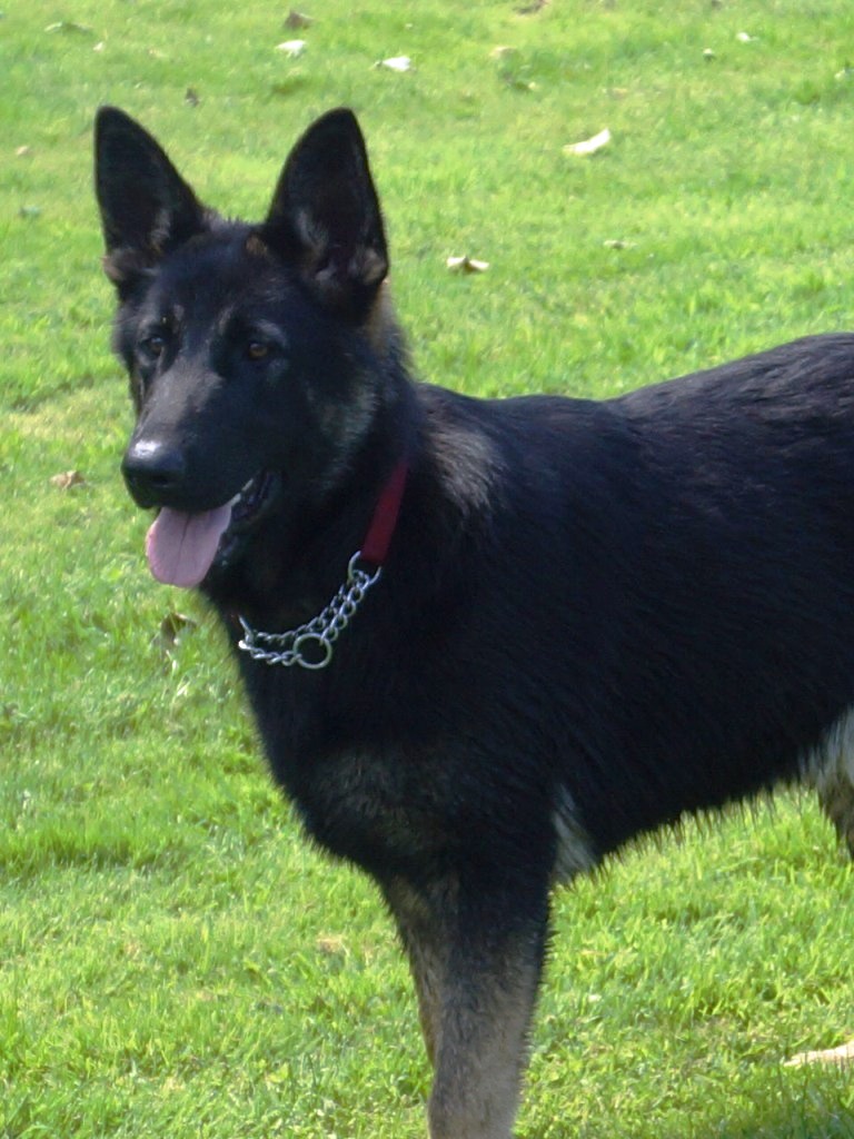 Jazz has the lovely loving nature inherited from her mum Jess and a great working temperament from her Dad and will go all out to be the first to reach the ball. She is an excellent mum with a strong maternal instinct. Again she is tall for a GSD with a very straight back. She also carries the long coat gene and when put to Tazar produced a beautiful mix of long and short coats. Jazz is the proud mum of our H, K and M Litters.