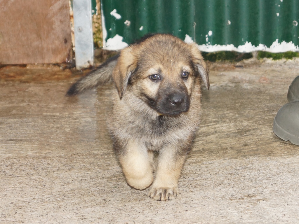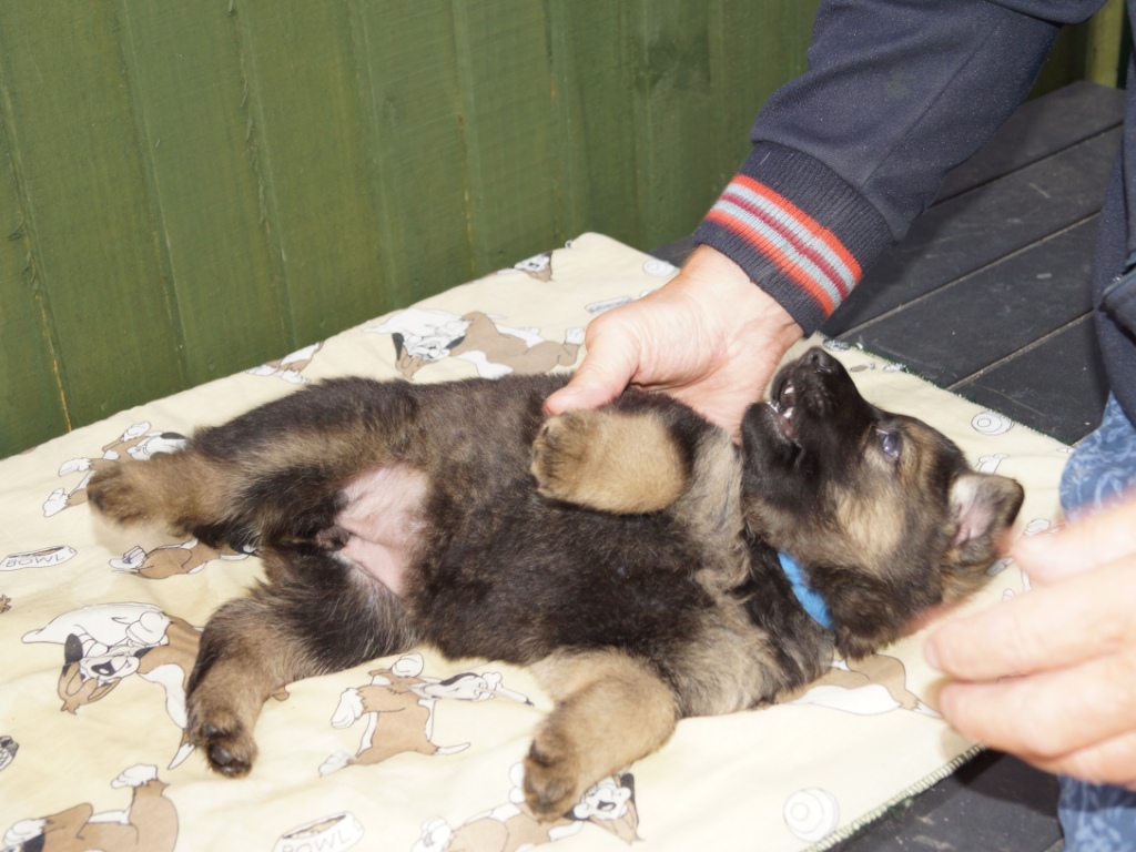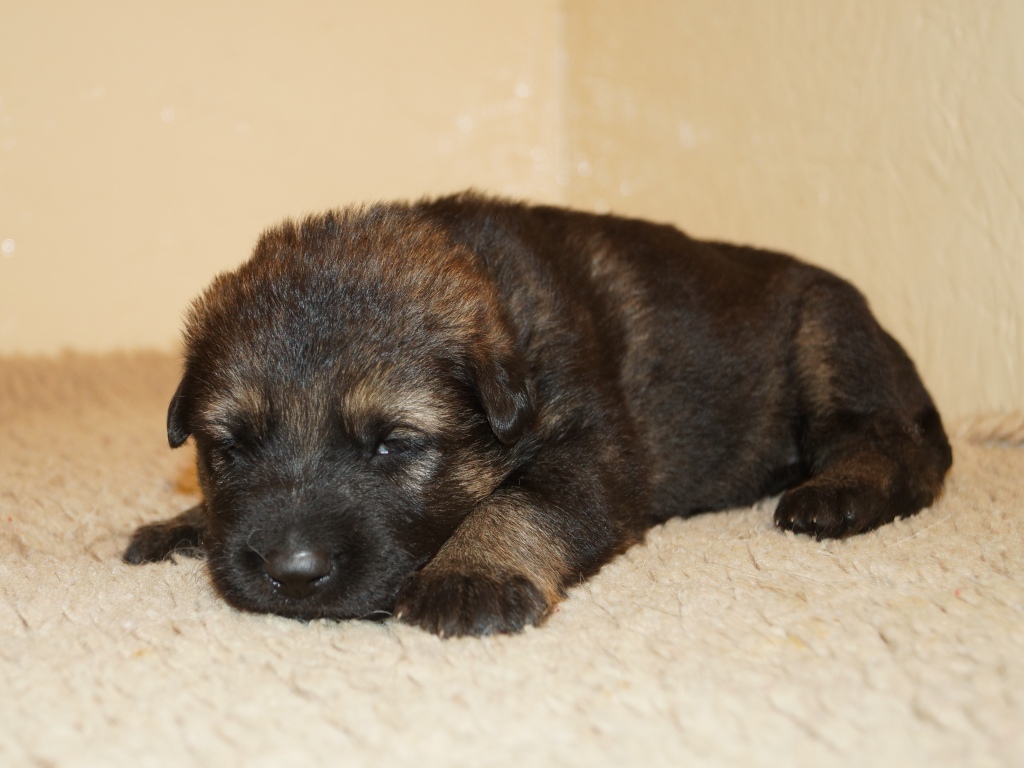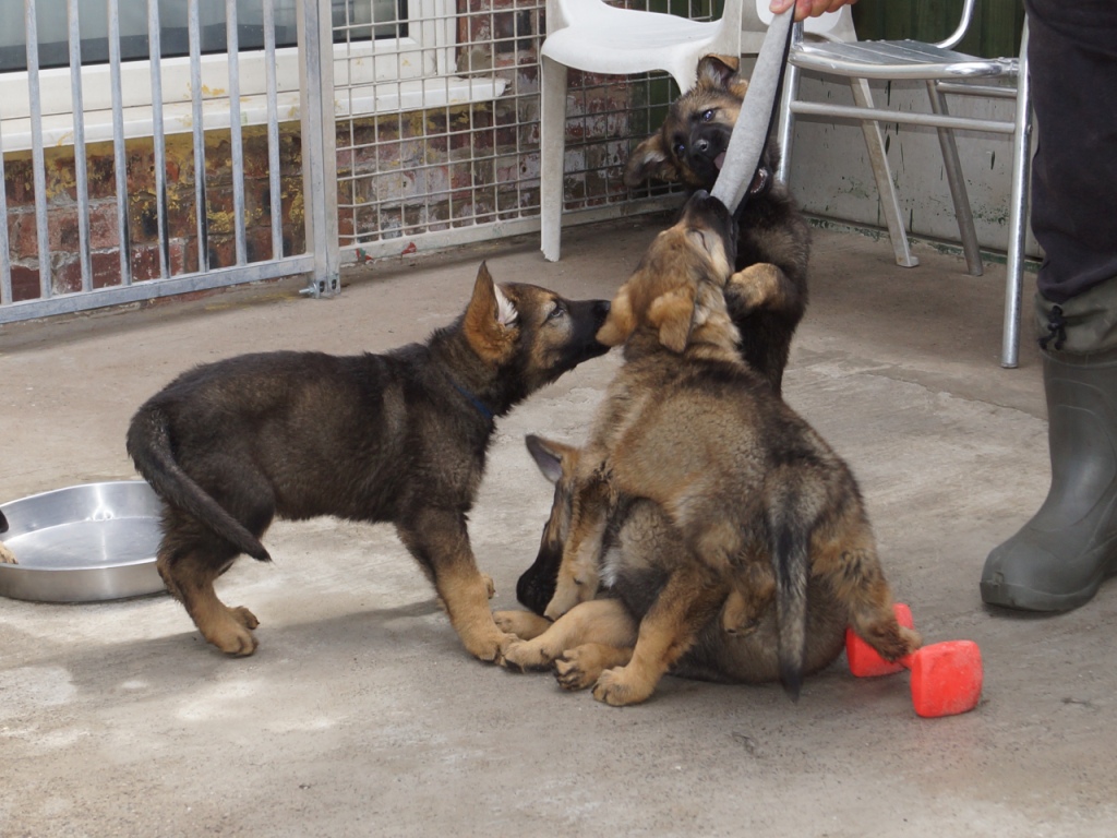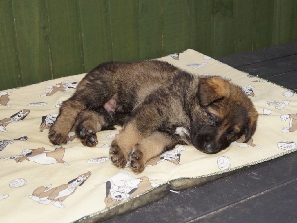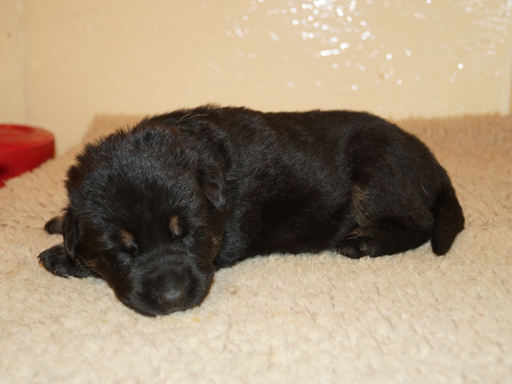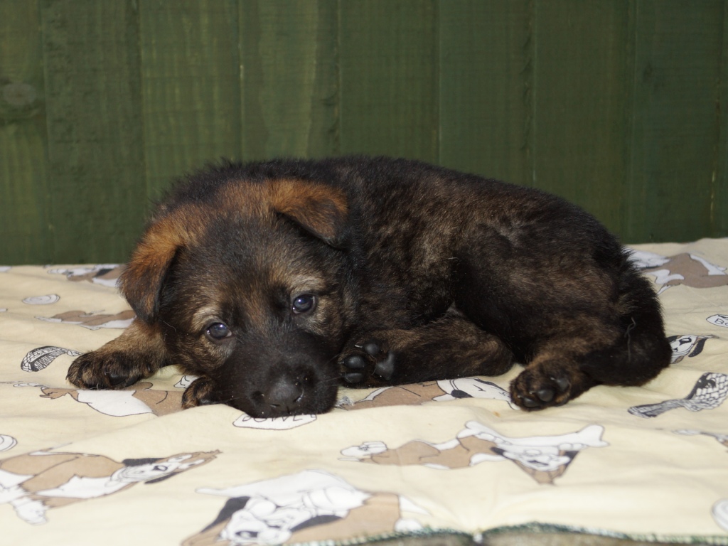The pups are 3 weeks old. They still spend most of their time sleeping but are quick to waken when they hear mum come in to check on them. They are now spending the day outside in the puppy run. Their teeth are coming through and we are now starting to wean them off mum.