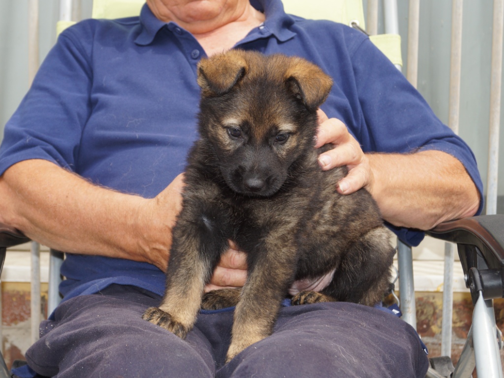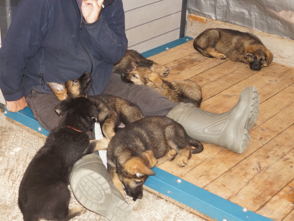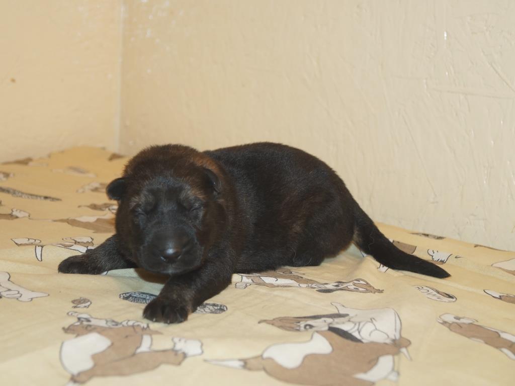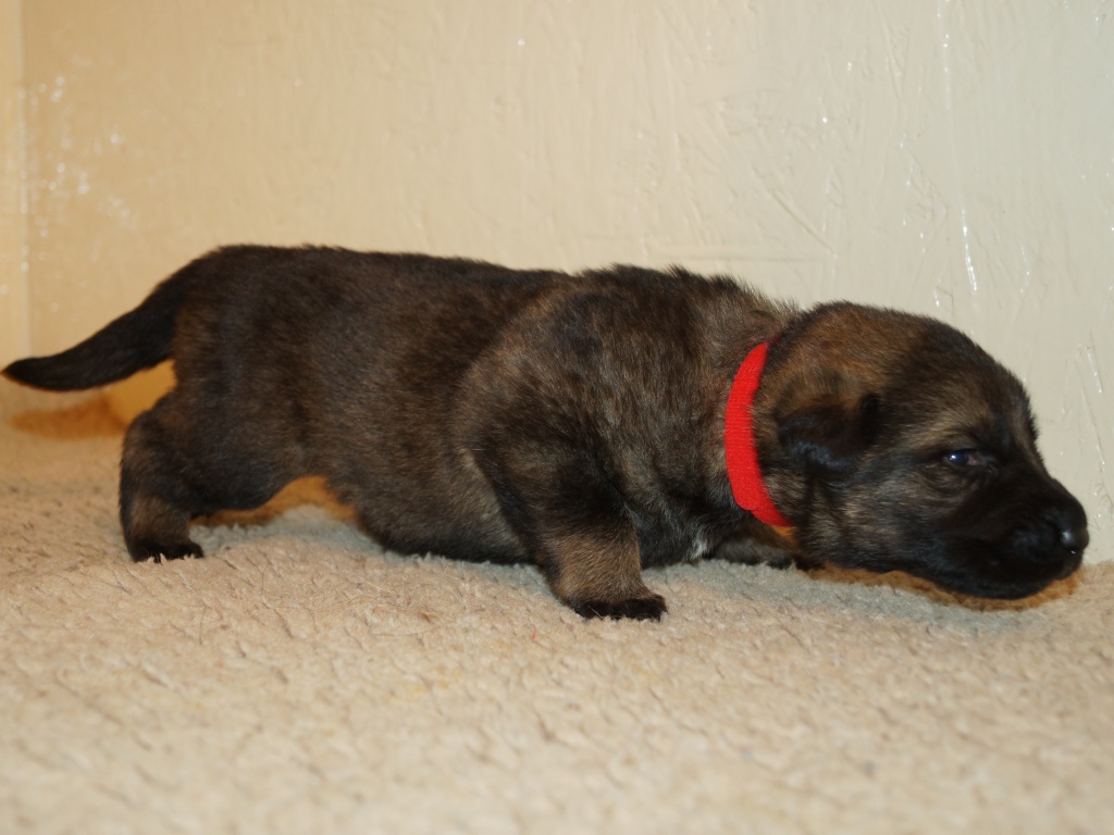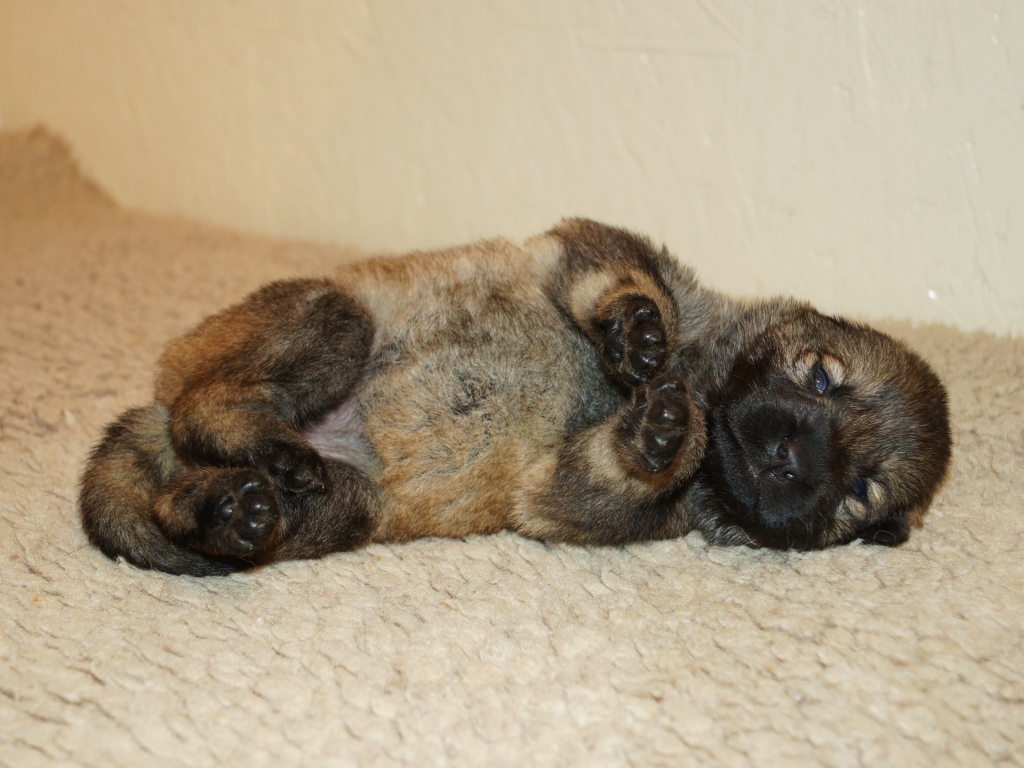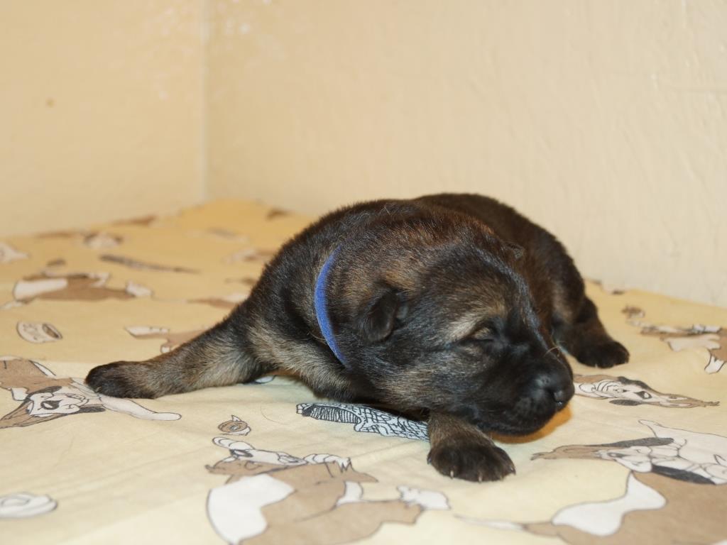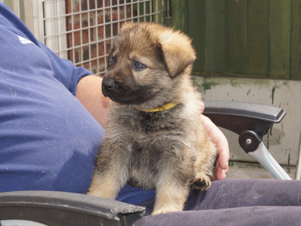 The pups are 3 weeks old. They still spend most of their time sleeping but are quick to waken when they hear mum come in to check on them. They are now spending the day outside in the puppy run. Their teeth are coming through and we are now starting to wean them off mum.