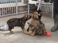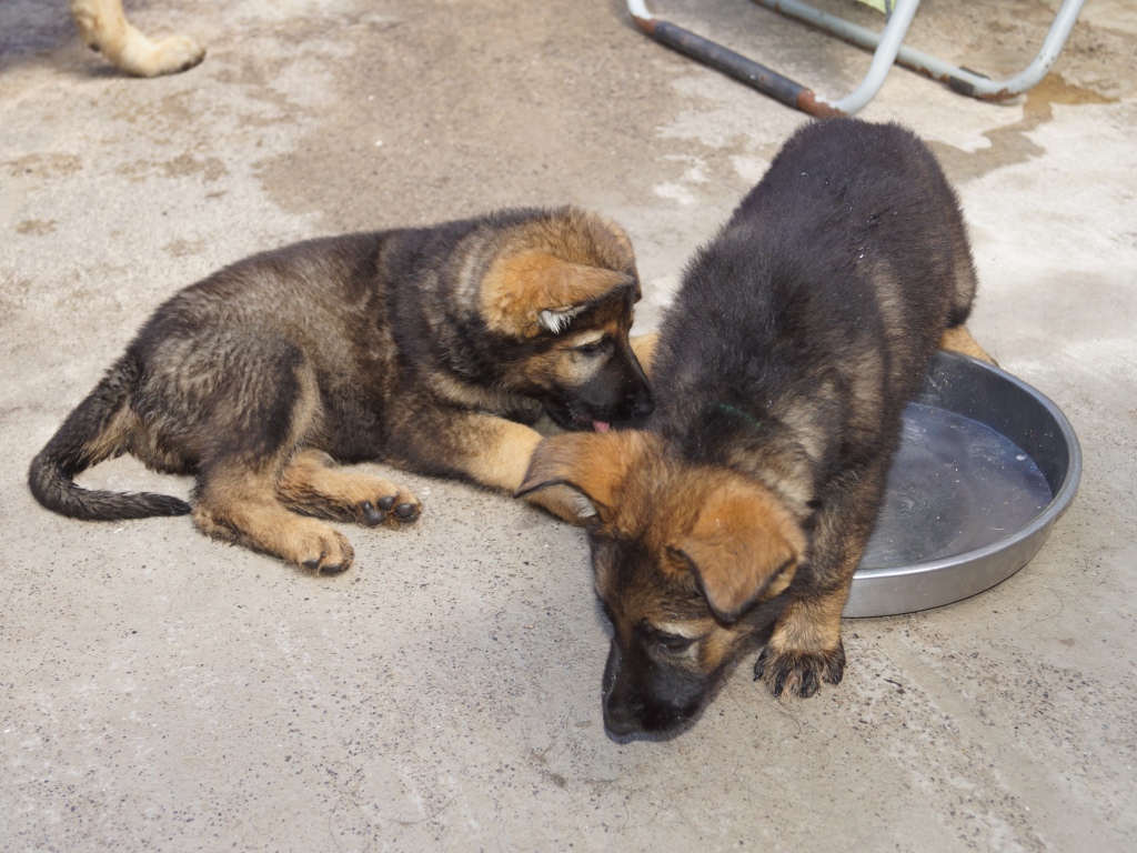 The pups are 4 weeks old. Big Changes this week for the pups. They have had their first visitors and are now spending all day out the puppy run with the big dogs. They have their own kennel if they want but apart from using it to ambush each other prefer laying outside in the shade with everyone else. Their favorite place to sleep is around the water bowl as it is cooler. Later today they are having their first car ride when they go for their first check up at the vets.