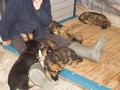 The pups at 5 weeks old. The pups have had their vet check and everyone passed with flying colours. The trip takes about half an hour each way and everyone was fine travelling. Wellingtons are a must now unless you want 6 pups hanging off your laces or even worse still if wearing sandals biting your toes. One of their favorite games is swinging off the toys we hang down or better still one of the big dogs tails.
