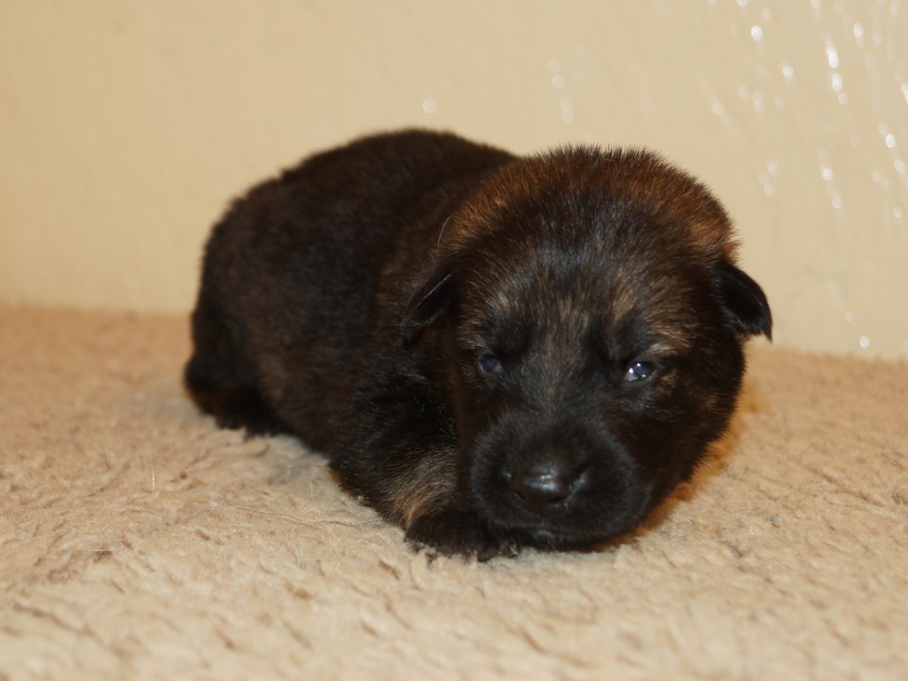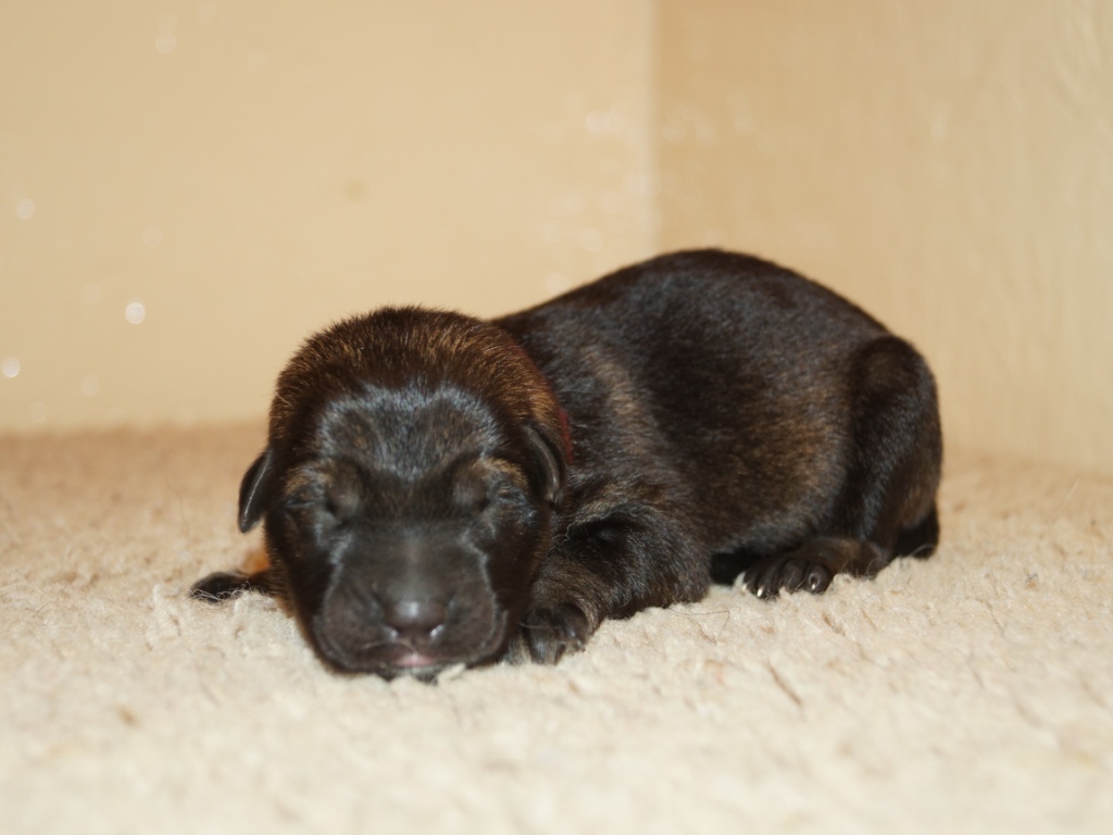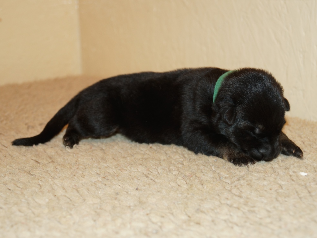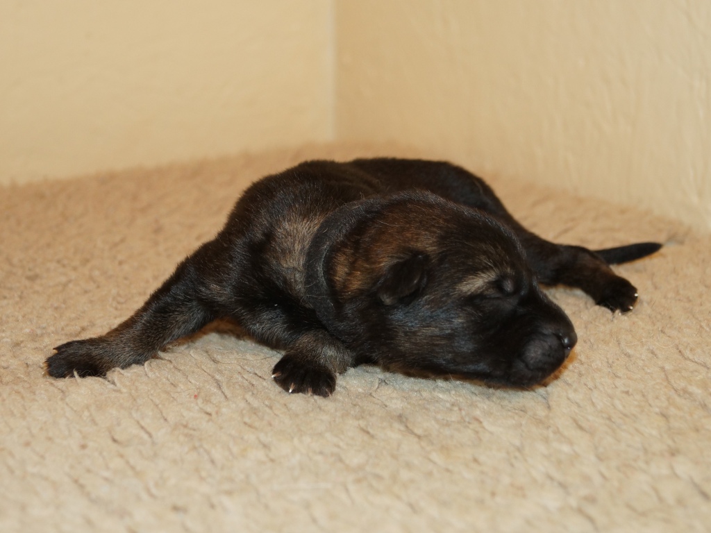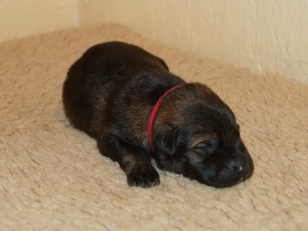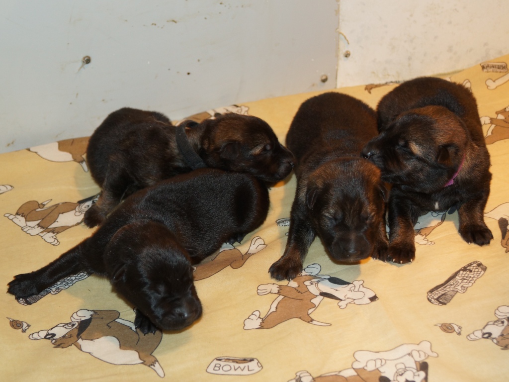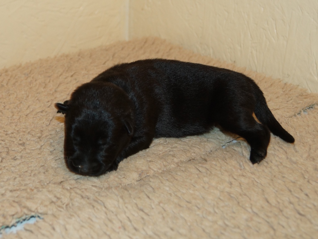The pups are 2 weeks old and although they may not look much different to last week they are growing stronger and bigger each day. They are starting to walk around and eyes are now opening. They are now going on their own to the paper to toilet. They are now starting to interact with each other and know when we come in it means extra food and quickly make their way over. The bottle off us is not really needed as Mum more than takes care of the feeding but it makes us feel part of the new family and prepares them for weaning off mum.