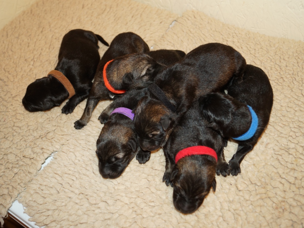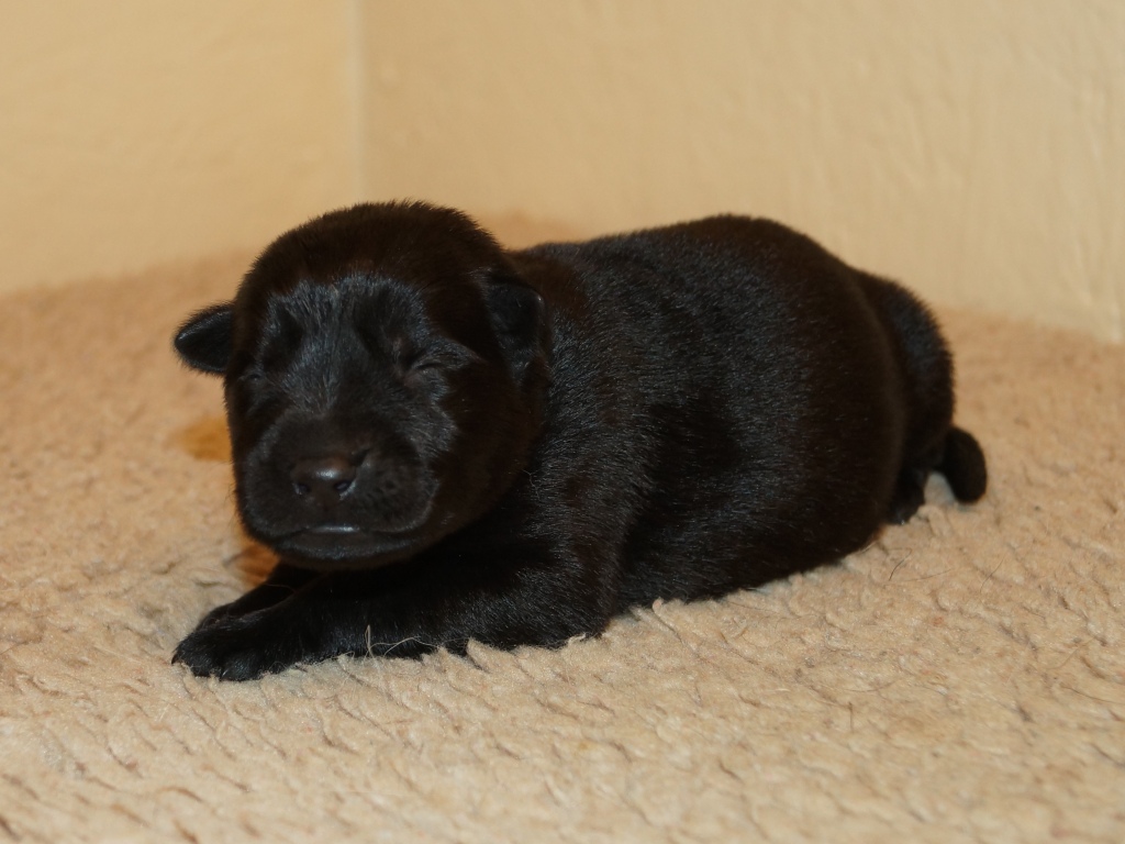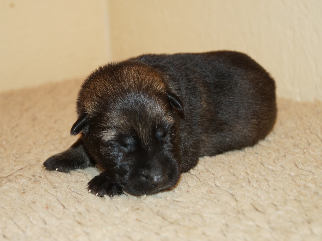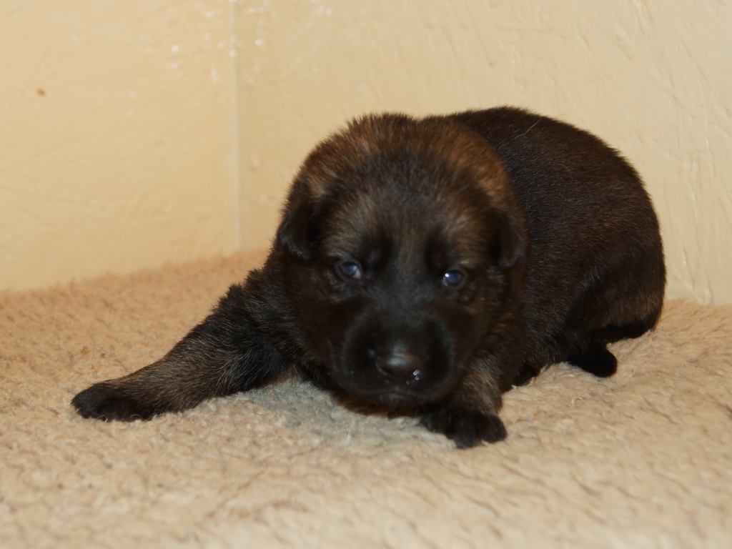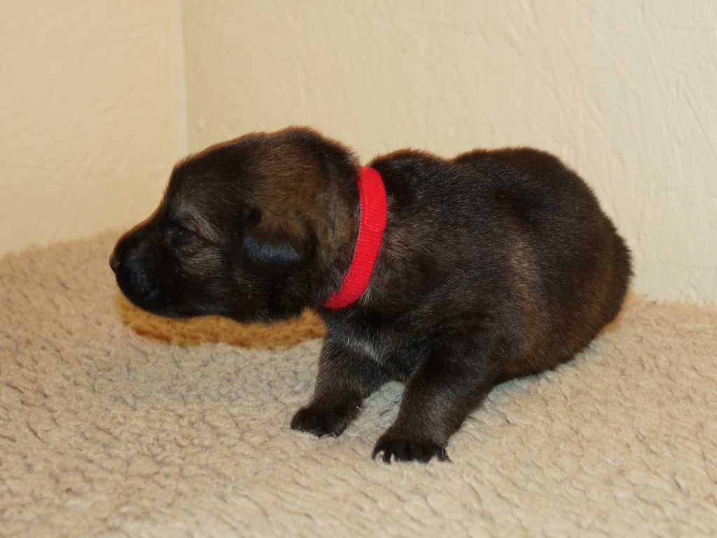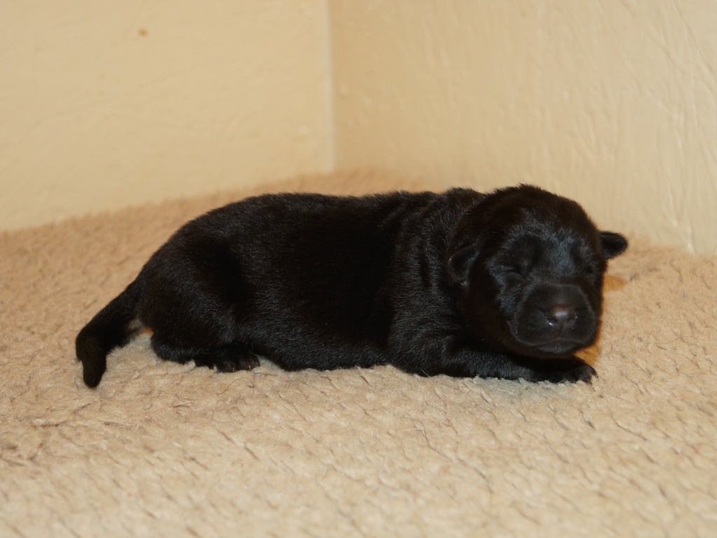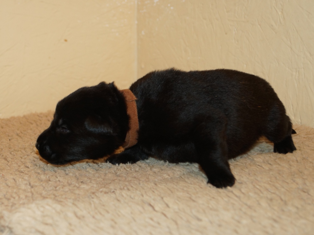 The pups are 2 weeks old and although they may not look much different to last week they are growing stronger and bigger each day. They are starting to walk around and eyes are now opening. They are now going on their own to the paper to toilet. They are now starting to interact with each other and know when we come in it means extra food and quickly make their way over. The bottle off us is not really needed as Mum more than takes care of the feeding but it makes us feel part of the new family and prepares them for weaning off mum.