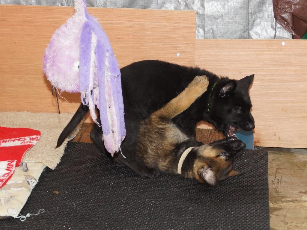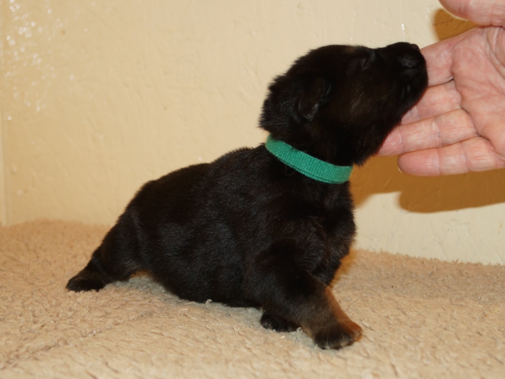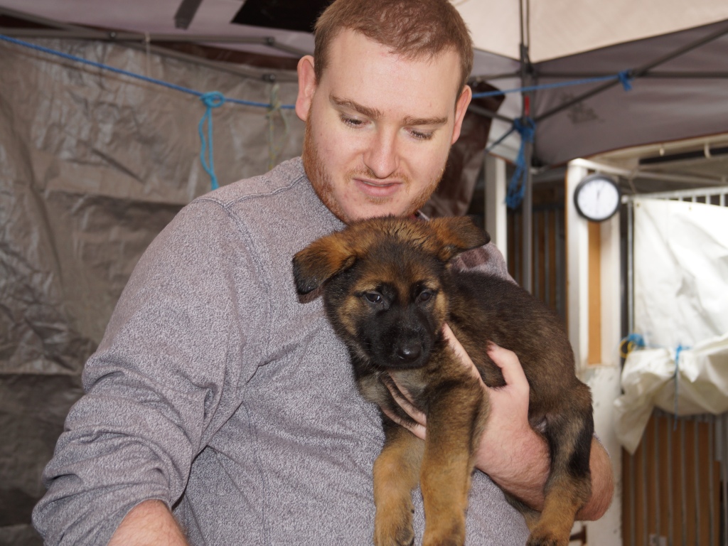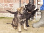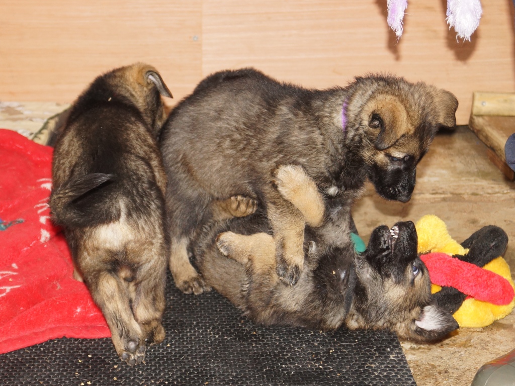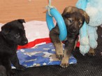 5 weeks old and what a difference a week makes. They are now awake for a lot longer and into everything. They love playing with Aunty Jeri as you can see from the pics and also had a visit from Jake (E Litter) whom the pups took to straight away, a new friend to play with. We finally got some sun today so they had the whole garden area to play in not that the rain stopped them. We also had our first pup with both ears up on Thursday