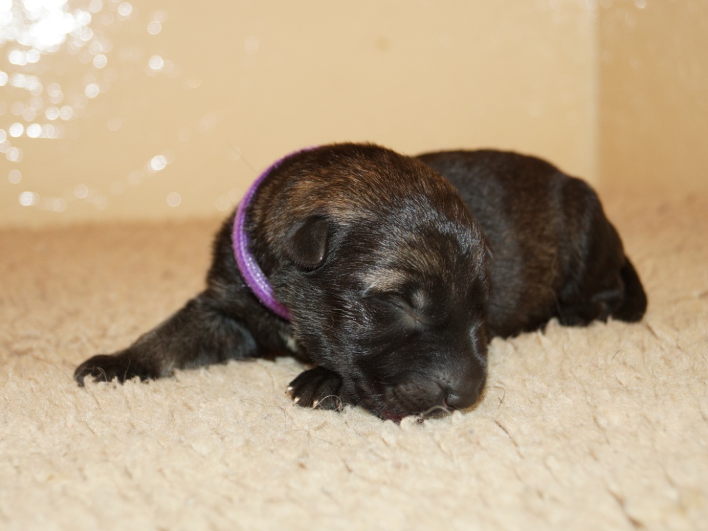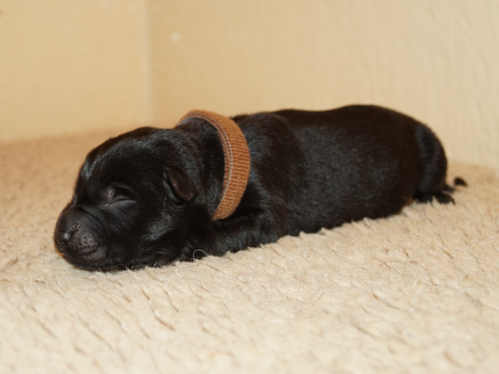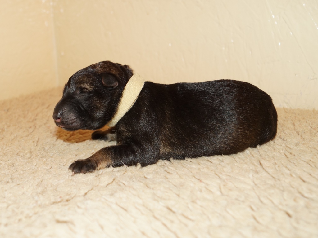 The first pictures of the pups at one and two days old. Jazz is a very proud, protective and slightly exhausted mum and very attentive to her little ones. All are progressing very well. Their collars may seem slightly too large at the moment but they will very quickly grow into them.